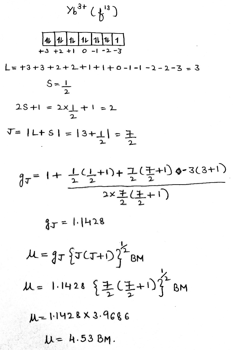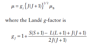 For the lanthanoids, where the spin-orbital coupling is strong, the orbital angular momentum contributes to the magnetic moment, and the ions behave like almost free atoms. Therefore, the magnetic moment must be expressed in terms of the total angular momentum quantum number J: