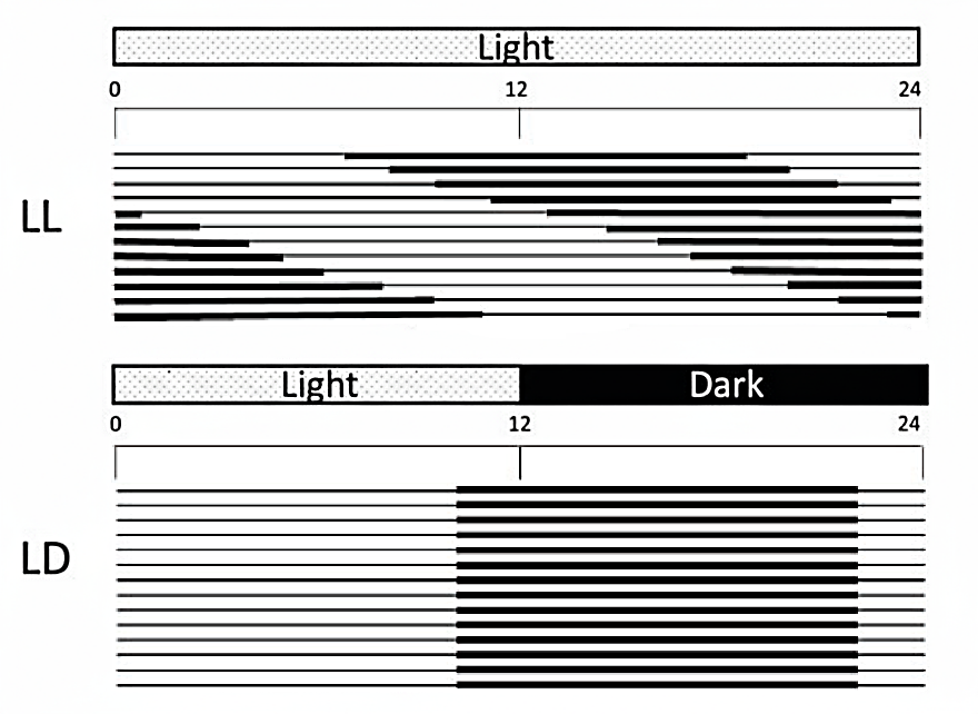 Exogenous light cues synchronize (entrain) the rhythm under LD.