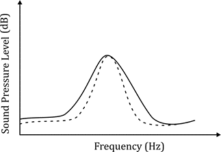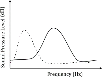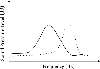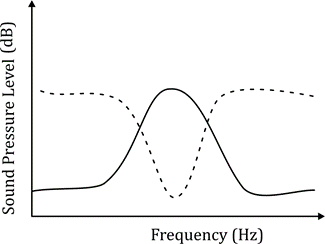 The hearing threshold curve (dashed lines) represents the sensitivity of females to different frequencies. Females are most sensitive to the species-specific frequency, meaning the hearing threshold at this frequency should be the lowest (or the curve should be closest to the power spectrum).
