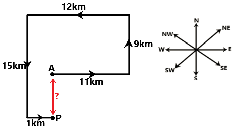 Kapil starts from point A and drives 9 km towards west. He then takes a right turn, drives 1 km, turns right and drives 5 km. He then takes a left turn and drives 3 km. He then takes a left turn and drive 5 km. He then takes a right turn and drives 8 km. He takes a final right turn, drives 9 km and stops at point P. How far (shortest distance) and towards which direction should he drive in order to reach point A again (all turns are 90° turns only unless specified)?