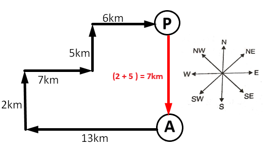 Manoj starts from Point A and drives 13 km towards west. He then takes a right turn, drives 2 km, turns right and drives 7 km. He then takes a left turn and drives 5 km. He takes a final right turn, drives 6 km and stops at Point P. How far (shortest distance) and towards which direction should he drive in order to reach Point A again (all turns are 90° turns only unless specified)?