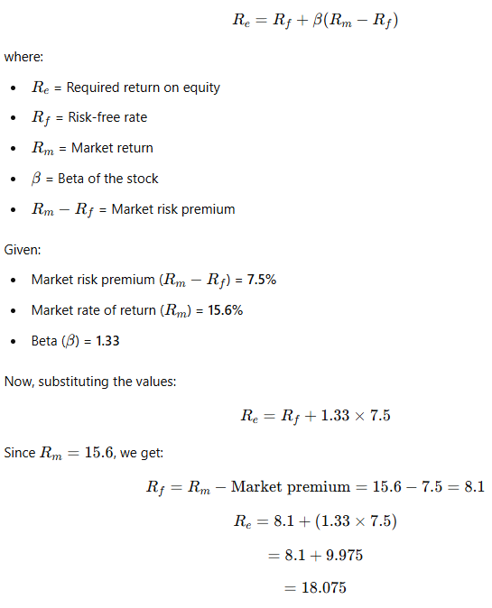 - Beta (β\betaβ) represents the stock's volatility relative to the market. A beta of 1.33 indicates that the stock is 33% more volatile than the market.