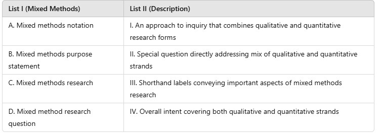 Mixed methods research integrates both qualitative and quantitative research approaches to provide a more comprehensive understanding of a research problem. The correct matching of Mixed Methods (List I) with their respective Descriptions (List II) is: