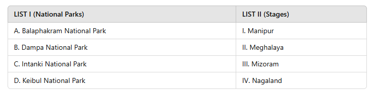 · B. Dampa National Park: This park is located in Mizoram, so it matches with III.