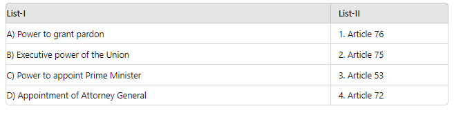 A) Power to grant pardon - Article 72: This article grants the President of India the power to pardon, commute, or remit sentences in certain cases.