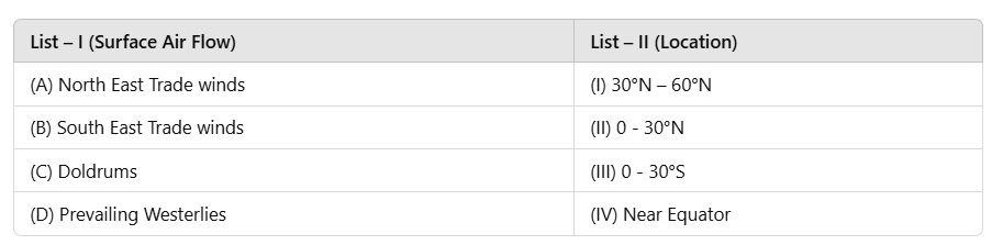 · (B) South East Trade Winds → (III) 0 - 30°S These winds occur in the Southern Hemisphere and blow from the southeast towards the equator.