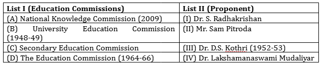 (B) University Education Commission (1948-49) – (I) Dr. S. Radhakrishnan: This commission, led by Dr. S. Radhakrishnan, focused on reforming higher education in India post-independence.