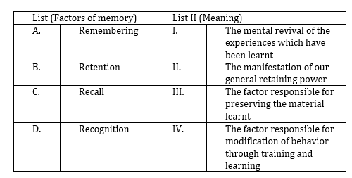 · D. Recognition - II: Recognition involves identifying something familiar, showcasing one's general ability to retain and identify previously learned material.