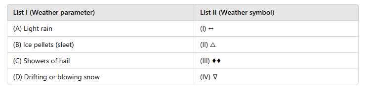 The correct answer is (a) A-III, B-II, C-IV, D-I. The weather symbols correspond to the parameters as follows: