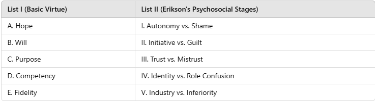 The correct matching of List I (Basic Virtue) with List II (Erikson’s Psychosocial Stages) is: