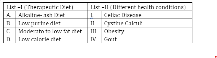 (A) Alkaline-ash Diet → Cystine Calculi: This diet helps in preventing the formation of cystine kidney stones by maintaining an alkaline urine pH.