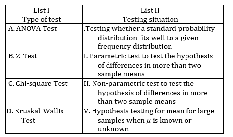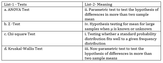 Kruskal-Wallis Test- It is also called H-test. It is used when the assumptions of one-way ANOVA are not met. It is a non-parametric (distribution-free) test. However, like most non-parametric tests, the Kruskal-Wallis test is not as powerful as the ANOVA.