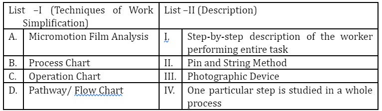 Micromotion analysis uses photographic devices to capture minute details of worker motions. These recordings are analyzed to improve task efficiency by eliminating unnecessary movements. Thus, Micromotion Film Analysis matches with (III) Photographic Device.Process Chart (B-I):