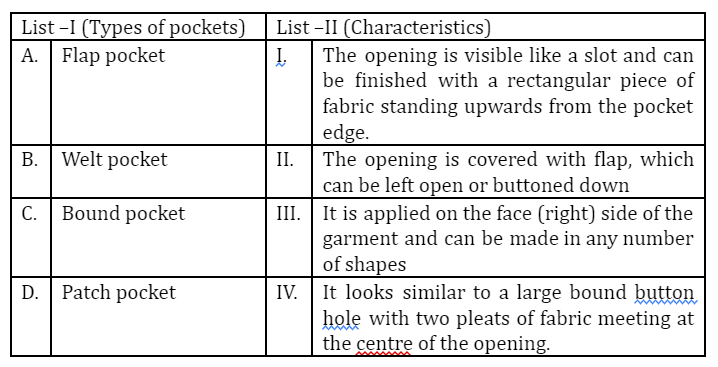 (D) Patch pocket → (III) It is applied on the face (right) side of the garment and can be made in any number of shapes