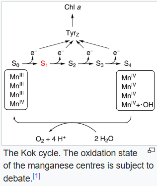 This conversion resets the catalyst to the S0 state. The active site of the OEC consists of a cluster of manganese and calcium. The mechanism of the complex is proposed to involve an Mn-oxide which couples by O-O bond formation to a calcium oxide/hydroxide.