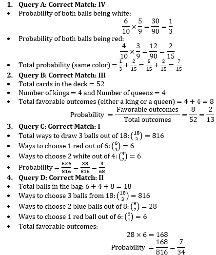 A bag contains 6 white and 4 red balls. Two balls are drawn at random. What is the chance, they will be the same colour? |
