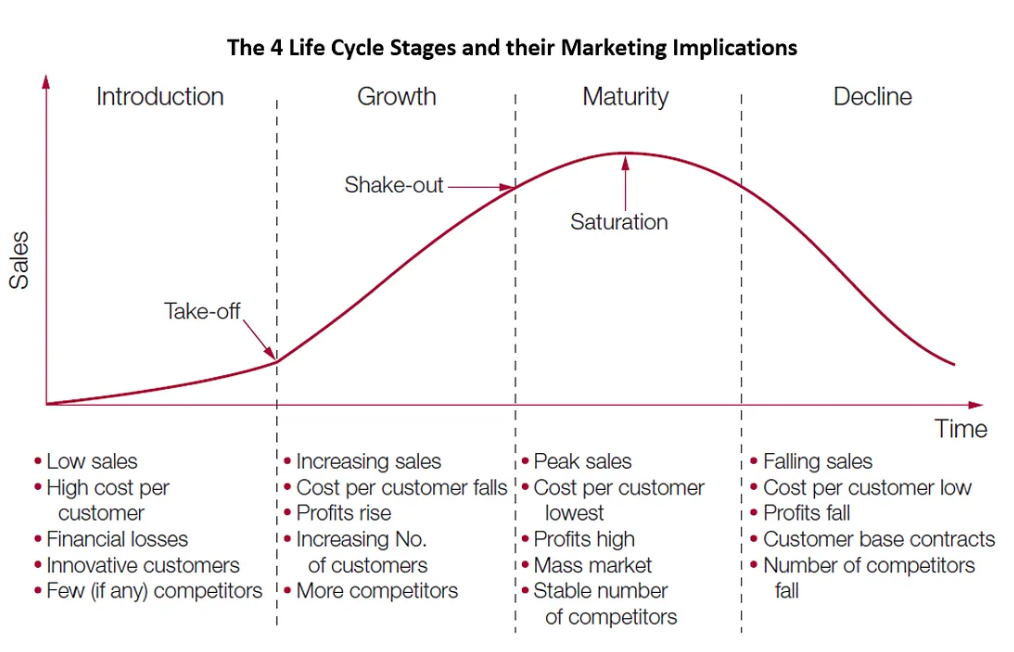 · C. Maturity: In this stage, sales growth slows down, competition intensifies, and the market becomes saturated. The bulk of the market, consisting of the III. Majority (Early Majority and Late Majority), has adopted the product. This group is more risk-averse than early adopters and adopts the product once it has been tried and tested.