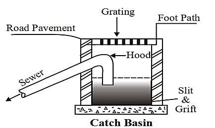 Catch basin - It allow the strom water to enter the sewer by eliminating the silt, grit, etc. at the bottom of the basin. It helps to maintain the efficiency of the sewer system & prevent blockages.