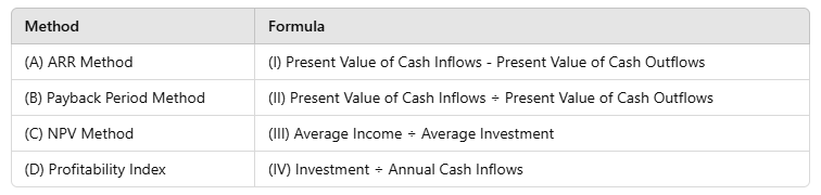 (B) Payback Period Method → (IV) Investment ÷ Annual Cash Inflows: The Payback Period determines how long it takes to recover the initial investment from cash inflows.