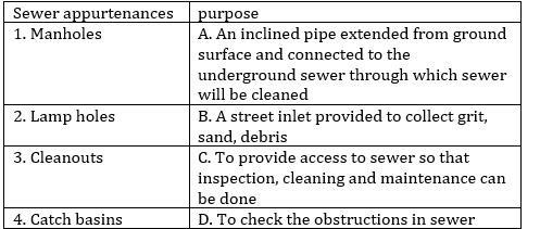 Cleanouts: It is an inclined pipe extended from ground surface and connected to the underground sewer through which sewer will be cleaned.