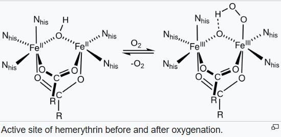 Hemerythrin is a major oxygen-transporting protein in marine invertebrates and has also been proposed to be an oxygen sensor in bacteria. The mechanism of dioxygen binding is unusual. Most O2 carriers operate via formation of dioxygen complexes, but hemerythrin holds the O2 as a hydroperoxide (HO2, or -OOH-). The site that binds O2 consists of a pair of iron centres. The iron atoms are bound to the protein through the carboxylate side chains of a glutamate and aspartates as well as through five histidine residues.
