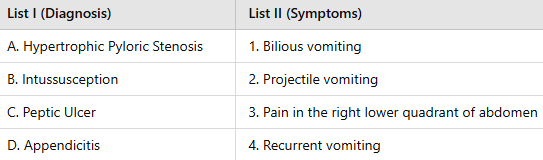· C. Peptic Ulcer: Typically presents with bilious vomiting as the stomach is affected by the ulcer.