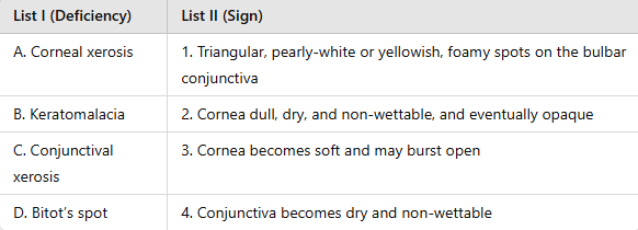 · C. Conjunctival xerosis: This condition involves the conjunctiva becoming dry and non-wettable. The corresponding sign is 4.