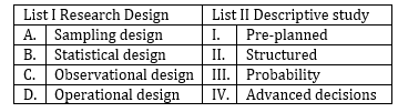 (c) A-III, B-I, C-II, D-IV Information Booster: 1. Sampling Design: Ensures that the sample represents the population effectively, especially critical in descriptive studies.