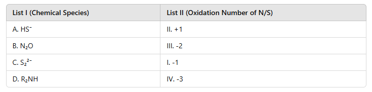 1. A. HS⁻ (Hydrosulfide ion) → II. +1: In HS⁻, hydrogen has an oxidation number of +1 because sulfur carries the -2 charge, balancing the ion's overall charge of -1.