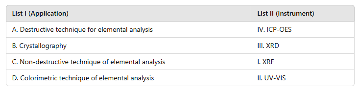 D. Colorimetric technique of elemental analysis (II - UV-VIS): UV-Visible spectroscopy (UV-VIS) is used to measure the absorbance of light in the visible range, which correlates to the concentration of specific elements or compounds.