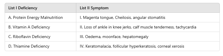 A. Protein Energy Malnutrition (PEM): This deficiency causes symptoms like