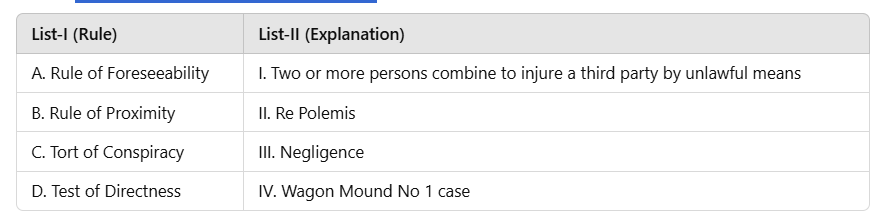 C. Tort of Conspiracy → I (Two or more persons combine to injure a third party by unlawful means): Conspiracy requires a combination of persons with intent to injure.