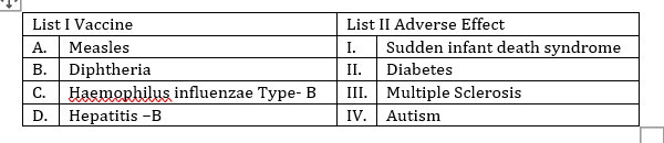 Haemophilus influenzae Type-B (C): The adverse effect associated with this vaccine is Diabetes. There have been some studies and claims suggesting a potential link between certain vaccines and autoimmune diseases, including Type-1 Diabetes, but the evidence is still debated.