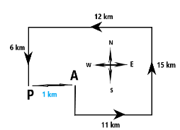 Mayank starts from Point A and drives 9 km towards the South. He then takes a left turn, drives 11 km, turns left and drives 15 km. He then takes a left turn and drives 12 km. He takes a final left turn, drives 6 km and stops at Point P. How far (shortest distance) and towards which direction should he drive in order to reach Point A again? (All turns are 90 degrees turns only unless specified)