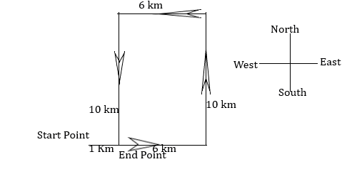 Gautam starts from Point A and drives 9 km towards south. He then takes a right turn, drives 4 km, turns right and drives 11 km. He then takes a right turn and drives 6 km. He takes a final right turn, drives 2 km and stops at Point P. How far (shortest distance) and towards which direction should he drive in order to reach Point A again? (All turns are 90° turns only unless specified.)