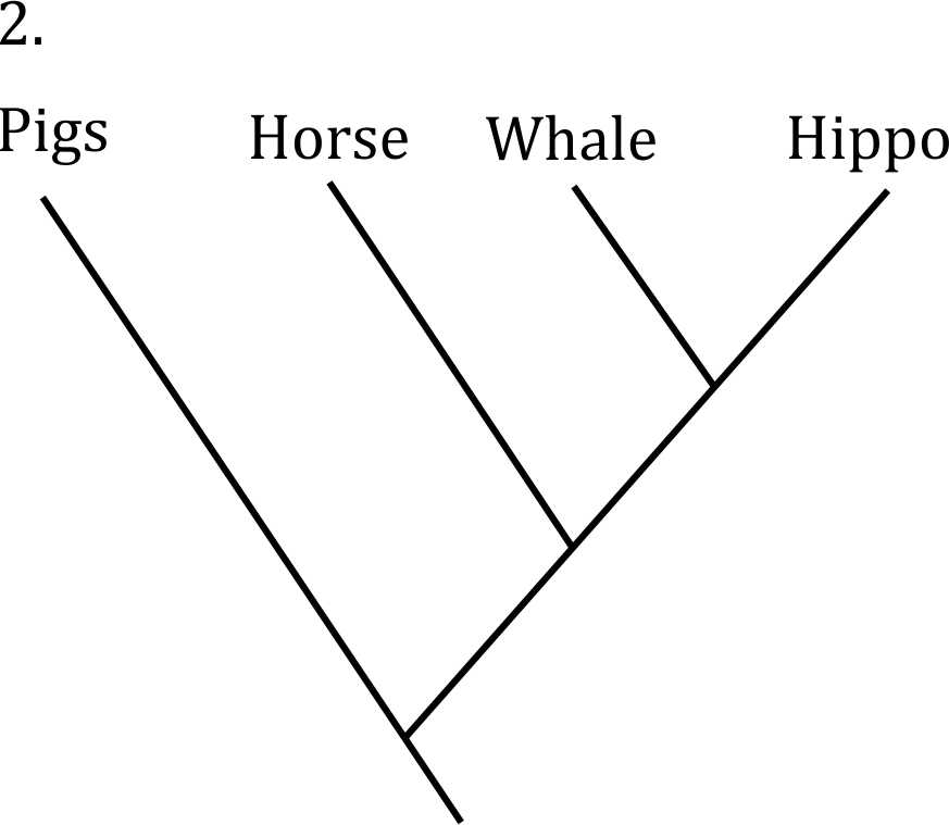 Molecular phylogeny suggests that whales are most closely related to artiodactyls, a group that includes animals like pigs, camels, and hippos. Among these, the hippo is considered to be the closest modern relative of whales. The correct tree is the one that places hippos and whales as sister groups, with pigs and other terrestrial mammals (like horses) branching off separately.