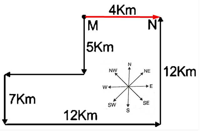 Mr. I starts from Point M and drives 5 km towards the south. He then takes a right turn, drives 8 km, turns left and drives 7 km. He then takes a left turn and drives 12 km. He takes a final left turn, drives 12 km and stops at Point N. How far (shortest distance) and towards which direction should he drive in order to reach Point M again? (All turns are 90 degree turns only unless specified.)