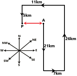 Mr. KLM starts from Point A and drives 21 km towards the south. He then takes a left turn, drives 7 km, turns left and drives 26 km. He then takes a left turn and drives 11 km. He takes a final left turn, drives 5 km and stops at Point P. How far (shortest distance) and in which direction should he drive in order to reach Point A again? (All turns are 90- degree turns only unless specified)