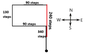 Muneer ran 340 steps towards north and then ran 90 steps after turning to his left. He then ran 130 steps towards his right. He then, turned towards his right and ran 90 steps. From there, he turned towards his right and ran another 240 steps. How far and in which direction is Muneer with respect to the starting point?