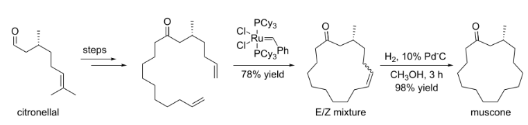 One asymmetric synthesis of (−)-muscone begins with commercially available (+)-citronellal, and forms the 15-membered ring via ring-closing metathesis: