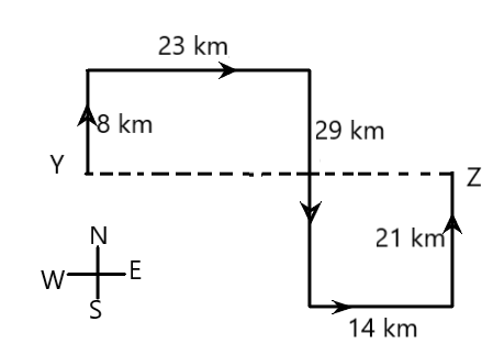 Nalin starts from Point Y and drives 8 km towards North. He then takes a right turn, drives 23 km, turns right and drives 29 km. He then takes a left turn and drives 14 km. He takes a left turn, drives 21 km and stops at Point Z. How far (shortest distance) and towards which direction should he drive in order to reach Point Y again? (All turns are 90 degrees turns only unless specified)
