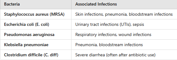 ✅ Urinary Tract Infections (UTIs) → Often caused by E. coli, linked to catheter use. ✅ Surgical Site Infections (SSIs) → Wound infections after surgery, often caused by Staphylococcus aureus. ✅ Pneumonia → Ventilator-associated pneumonia (VAP), caused by Pseudomonas aeruginosa. ✅ Bloodstream Infections (Sepsis) → Related to IV catheters and central lines.