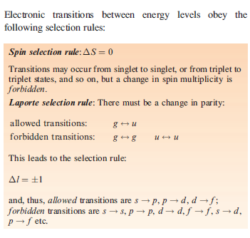 The Laporte rule is a rule that explains the intensities of absorption spectra for chemical species. It is a selection rule that rigorously applies to atoms, and to molecules that are centrosymmetric, i.e. with an inversion centre. It states that electronic transitions that conserve parity are forbidden. Thus, transitions between two states that are each symmetric with respect to an inversion centre will not be observed. Transitions between states that are antisymmetric with respect to inversion are forbidden as well. In the language of symmetry, g (gerade = even (German)) → g and u (ungerade = odd) → u transitions are forbidden. Allowed transitions must involve a change in parity, either g → u or u → g.