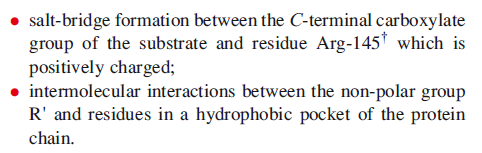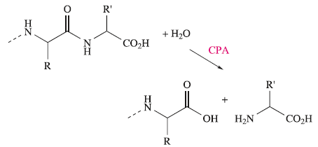 Carboxypeptidase A (CPA) is a pancreatic metalloenzyme which catalyses the cleavage of a peptide link in a polypeptide chain. The site of cleavage is specific in two ways: it occurs at the C-terminal amino acid, and it exhibits a high selectivity for substrates in which the C- terminal amino acid contains a large aliphatic or Ph substituent. The latter arises from the presence, near to the active site, of a hydrophobic pocket in the protein which is compatible with the accommodation of, for example, a Ph group