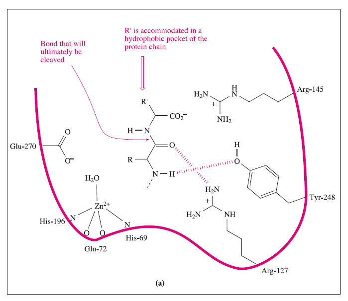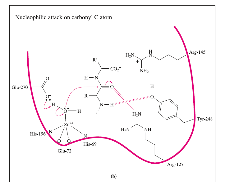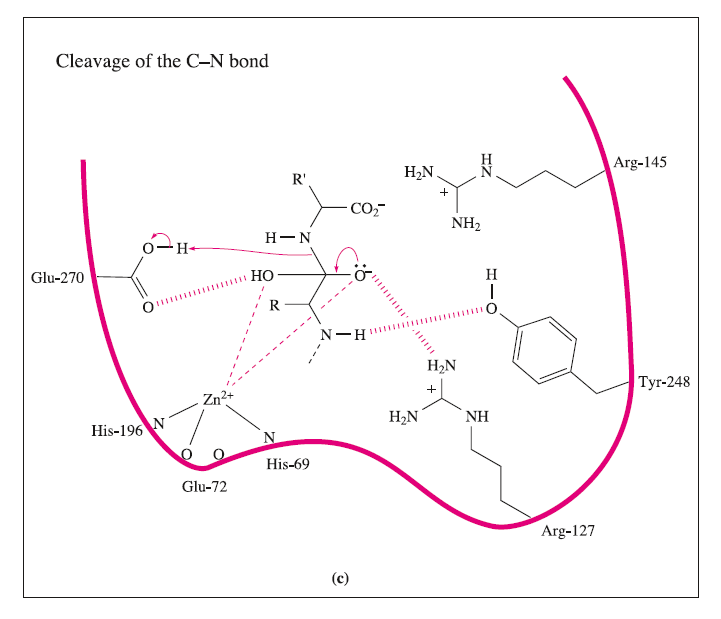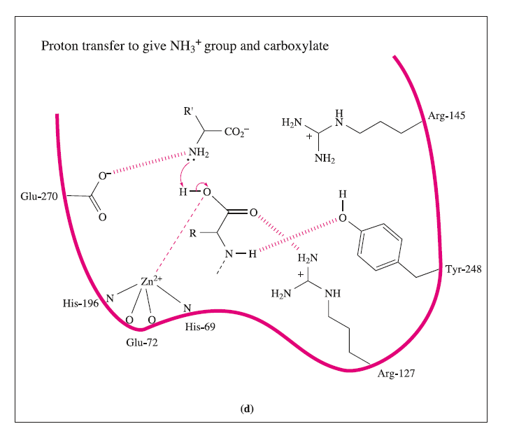 These interactions may be supplemented by hydrogen bond formation between the OH group of Tyr-248 and the N-H group indicated in the figure, and between Arg-127 and the C=O group adjacent to the peptide cleavage site. This latter interaction polarizes the carbonyl group, activating it towards nucleophilic attack. The nucleophile is the H2O ligand coordinated to Zn2+.The Lewis acidity of the metal ion polarizes the O-H bonds, and (although this is not a unique proposal) it is likely that the carboxylate group of Glu-270 assists in the process by removing H+ from the H2O ligand. The cleavage of the peptide C-N bond for which H+ is probably provided by Glu-270. It appears likely that the second H+ required for the formation of the [NH3]+ group on the departing terminal amino acid comes from the terminal CO2H group of the remaining portion of the substrate.Glu-72 bound in a monodentate manner to the Zn2+centre, whereas in the rest state, a bidentate mode has been confirmed. A change from a bi- to monodentate coordination appears to be associated with the formation of the