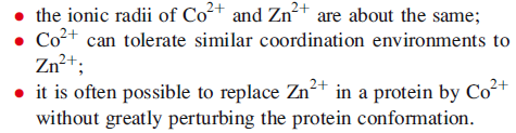 A practical disadvantage of working with metalloproteins containing Zn2+ is the d10 configuration of the ion. The metal site cannot be probed by using UV-VIS or EPR spectroscopies or by magnetic measurements. Such methods were especially important before protein crystallography became a widely applied technique. Studies involving Co2+-for-Zn2+ substitution provide a metal centre that is amenable to investigation by spectroscopic and magnetic techniques (Co2+ is a d7 ion), the choice of Co2+ being because:
