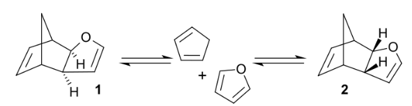 The Diels–Alder reaction of cyclopentadiene with furan can produce two isomeric products. At room temperature (ambient conditions), kinetic reaction control prevails and the less stable endo isomer 2 is the main reaction product. At 81 °C and after long reaction times, the chemical equilibrium can assert itself and the thermodynamically more stable exo isomer 1 is formed. The exo product is more stable by virtue of a lower degree of steric congestion, while the endo product is favoured by orbital overlap in the transition state.