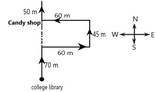 Pallavi walked from her college library, 70 m towards the north, then 60 m towards the east, then 45 m towards the north and then 60 m towards the west. She stopped at this point to buy some candies from a candy shop. She again walked 50 m towards the north. How far and in which direction is Pallavi's college library from the candy shop?