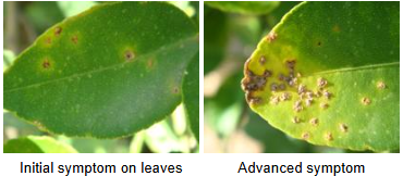 · Circular lesions with a yellow halo appear on both sides of the leaf, severe in acid lime.