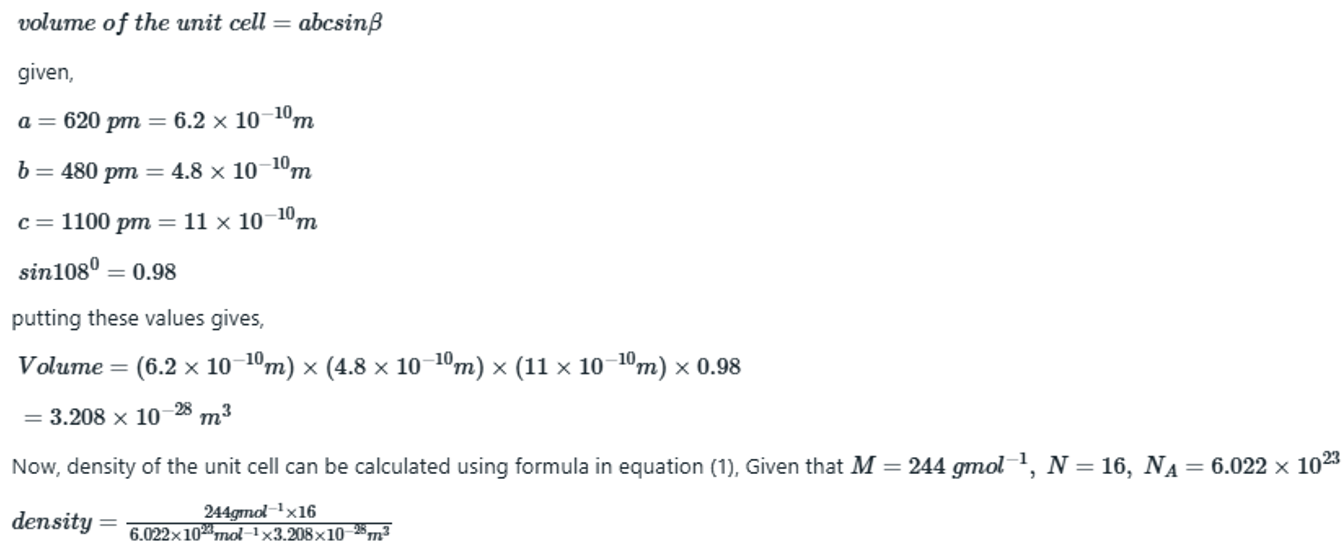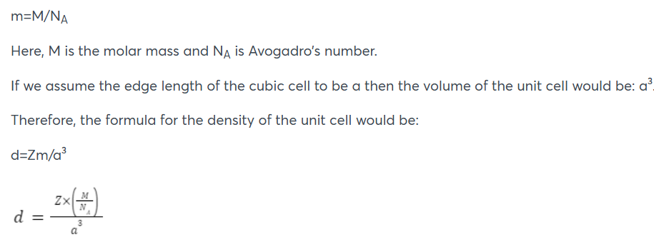 A unit cell’s density is defined as the ratio of its mass to its volume. The mass of the unit cell can be calculated by multiplying the total number of atoms present in the unit cell and the mass of each atom.
